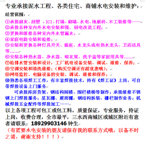 [装修咨讯] 专业承接泥水工程、各类住宅、商铺水电安装和维护