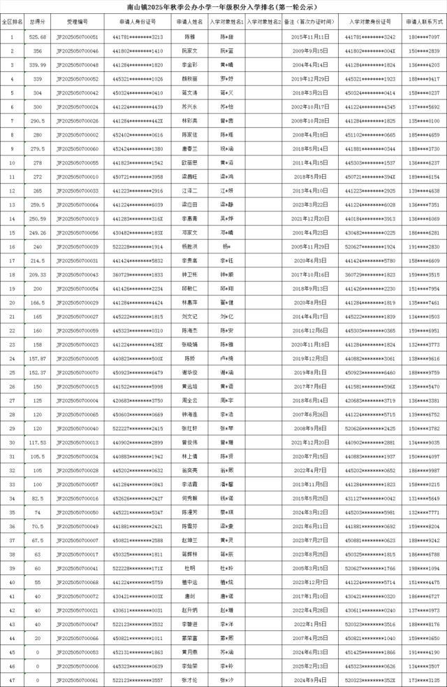 附件:南山镇2025年秋季公办小学一年级积分入学排名(第一轮公示)