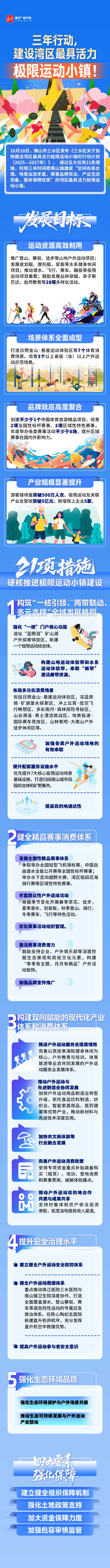 10月18日,《三水区关于加快建设湾区最具活力极限运动小镇的行动计划(2025-2027)》(下称“行动计划”)正式发布,提出到2027年,把南山镇打造成为一个运动资源高效利用、场景体系全面成型、品牌效应高度聚合、产业规模显著提升的湾区极限运动小镇。