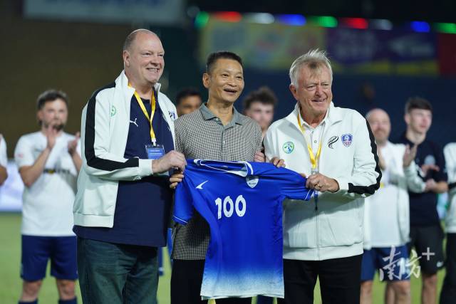 三水区委书记李军向英国代表赠送百年见证球衣。
