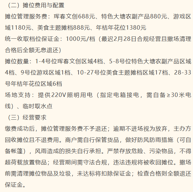 花市严格划分珲春文创、特色大塘农副产品、游戏区域、美食主题摊档、年桔年花位五大经营品类,规划33个专属摊位,匹配不同品类的经营需求,满足商户货品陈列与经营空间需求。
