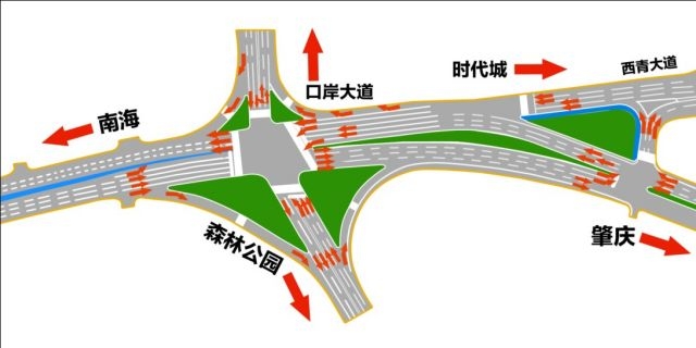 据悉,该方案将在广海大道东往西(广州往肇庆)方向车辆通过交叉路口处,设置4条直行车道往肇庆方向,另设1条左转车道往口岸大道,距交叉路口提前50米设置不受信号灯控制的右转专用车道进入森林公园。而广海大道东往西(肇庆往广州)方向及北江新区出来的车辆则在西青大道合流后进入交叉路口,往口岸大道需右转通过专用车道,往森林公园则左转。