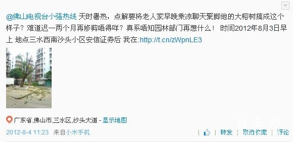 近日,有市民在三水本地论坛上发帖质疑树木被修剪得太厉害。网友“无良”称,恒益后面小区的树木,已经长了二十多年了,最近所有枝叶被剪光,修剪成一条棍。“这究竟是美化还是残害?”该网友如是质问。